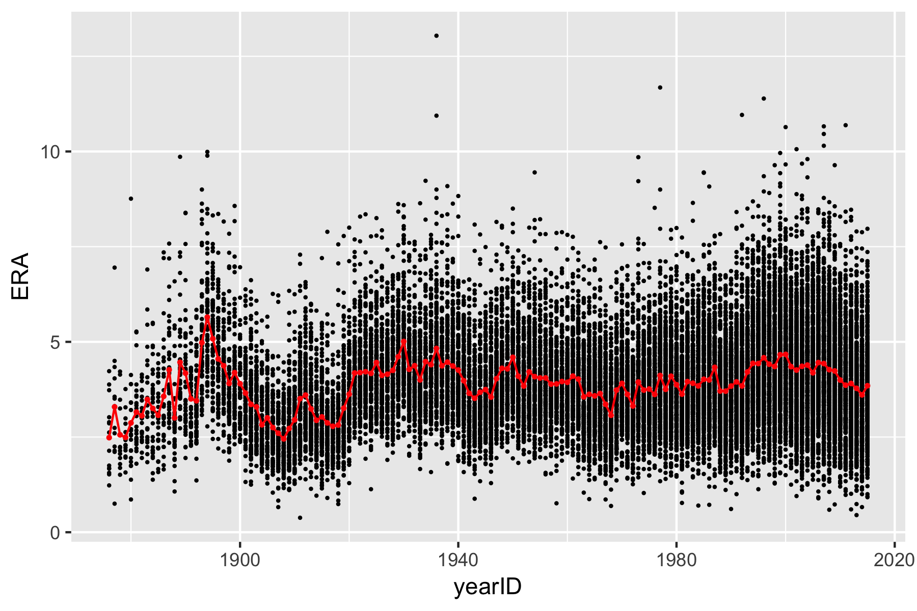geom_line(data = pitching_summary, mapping = aes(x = yearID, y = mean), col = 'red')