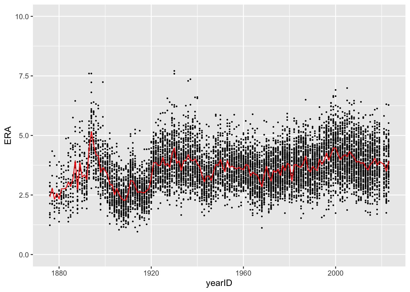 We started this module with a figure similar to one from Professor Wyner’s class that plotted ERAs over time. When we run the following code, we get a plot that’s very similar to the desired one but that is missing the red line showing the average ERA within each season.