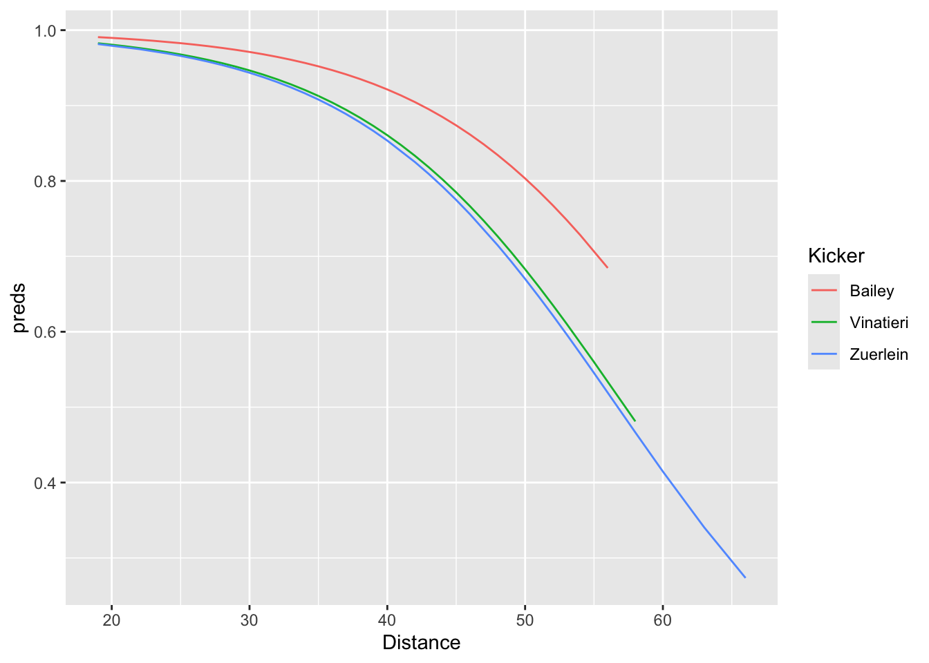 geom_line(mapping = aes(x = Distance, y = preds, color = Kicker))