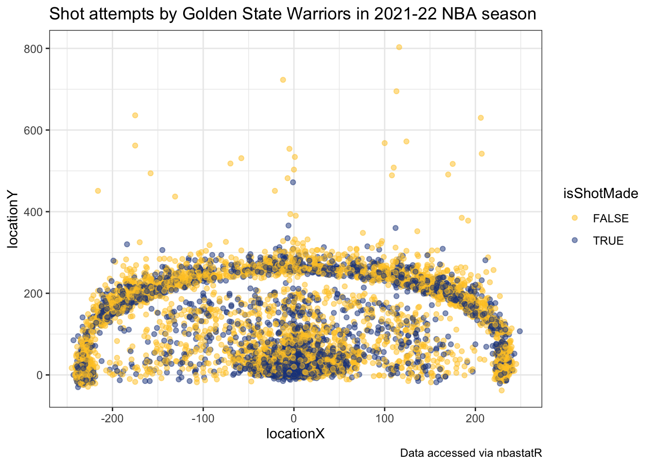 Using this shot data, we can view the all shot attempts by the Warriors throughout the season colored by whether or not they made the shot.